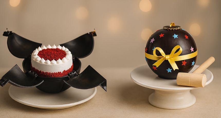 Bomb cakes offer a dramatic hidden gift when their shells are opened with a sparkler effect. They pop up a showstopper inside that brings a big surprise element in action. Pinata cakes carry a breakable chocolate dome or covering.