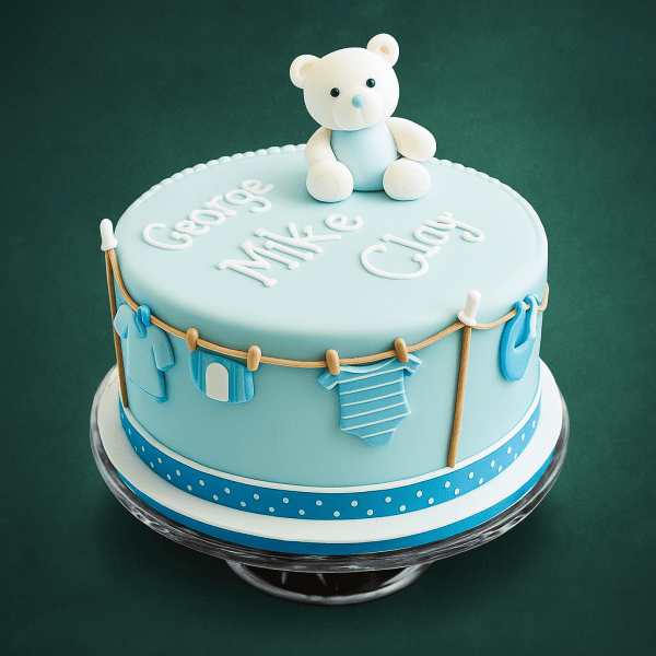 Celebrate the joyous arrival of your newborn baby with our new born baby cake. The cake features a fondant teddy bear topper and edible onesie cutouts strung along a clothesline motif. You can personalize this cake with your baby’s name, calendar with date, custom message, etc. This is a perfect treat for baby showers, welcome home parties, or naming ceremonies. Made with premium quality ingredients, available in various flavours and sizes. Book your order for same-day delivery.