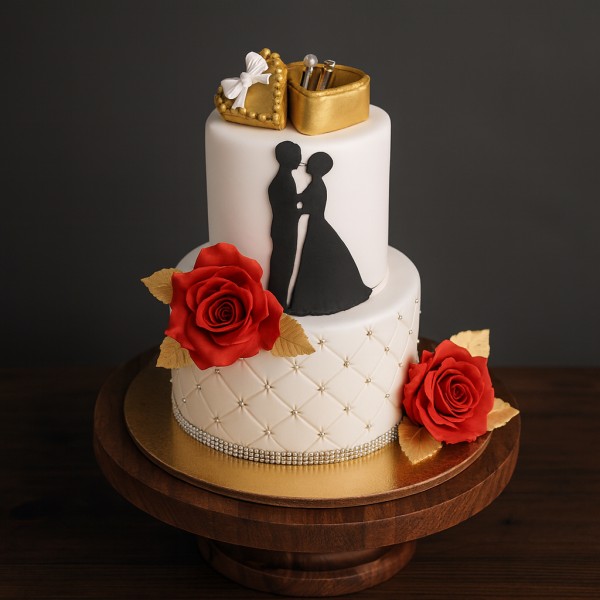 Celebrate your engagement in style with this gorgeously designed couple theme cake. Freshly baked and eggless, it includes a golden ring topper, red roses, and a romantic design to make your celebration extraordinary.