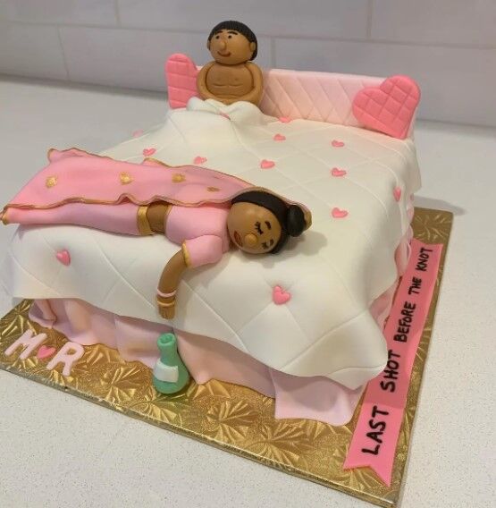 This good bad ‘Last Shot Before the Knot’ cake is designed like a bed with pink covers, featuring the couple-like fondant on the top. Perfect for a bachelorette party, this fresh and naughty cake comes in a variety of flavors and sizes, perfect for the bride-to-be’s celebration. To make the event even more memorable.