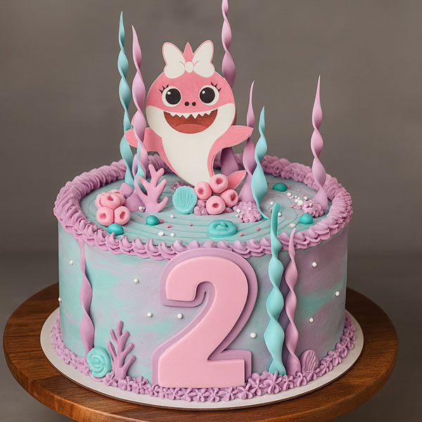 Make your little one’s second birthday extra special with this beautiful pink baby shark cake. The cake is decorated with baby shark topped baby shark topper and under the sea detail. this is a perfect cake for a themed party a little one’s birthday. Choose from a variety of flavors and sizes. Enjoy our same-day delivery to your doorstep.