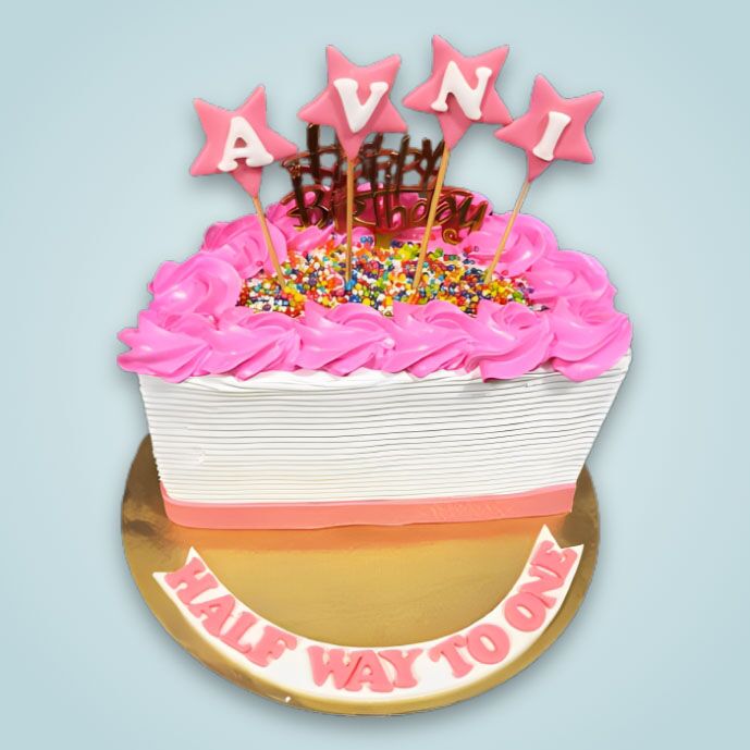 Taste the sweetness of a half-year milestone with our Pink Chocolate Half Cake. Beautifully crafted with 100% eggless chocolate cake and topped with beautiful cream pink roses, it’s made with love for your special six-month celebrations, from baby’s first half-birthday to a couple’s semi-anniversary. A perfect cake to make the day memorable!