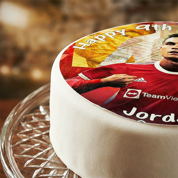 Celebrate your love for football with a personalized Ronaldo photo print cake. This cake features an edible photo print of a football star on top with a birthday message and name. 100% eggless and made with high-quality ingredients. Available for same-day delivery.